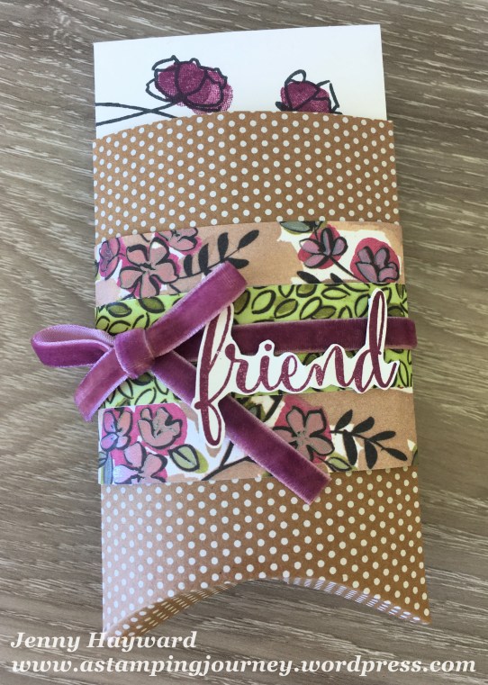 Assemble the Kraft Pillow Box. Then wrap a strip of the Peaceful Poppies Designer Series Paper around the Pillow Box. I wrapped around some more ribbon I had coloured around the box too.