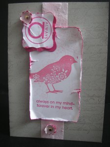 I stamped the Sahara Sand base card with ‘French Script’ that I stamped off on scrap paper first to lighten it a little. The pink strip is a faux suede effect which was fun to do. I’ll tell you about that another time. I inked the heart from “always” set with Pink Pirouette and stamped it on the whisper white card. Then stamped the bird in Regal Rose and the greeting in Melon Mambo. I tore the edge of the card and distressed it with the bone folder, then inked the edges. The ‘a’ was stamped in Melon Mambo and punched out with the curly label punch. I inked the edge of this and layered it with a Melon Mambo piece. Once I had put it all together, I punched out some flowers with the Boho Blossoms Punch and distressed them a bit and put some gold brads through them before mounting them with dimensionals.