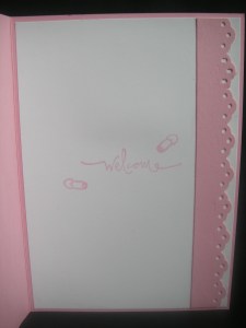 I added a piece of Whisper White to the bottom inside. I stamped the duck in the Tempting Turquoise too. The greeting is from Sale-A-Bration set ‘Sky is the Limit’ which is no longer available either. 😦 I stamped it and then cut the greeting with the ‘Project Life Cards and Labels Framelits’
