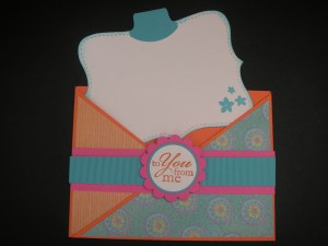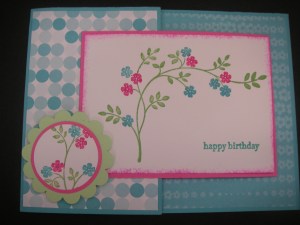 The 2nd card we did was the criss-cross card which can be found here. This was another bright and funky card using the “Kaleidoscope” DSP. For the inside card I cut a top note from Whisper White, added a tab using the circle tab punch. I sponged the edges with Tempting Turquoise and the small flowers are from “Cottage Garden”. On the front of the criss cross pocket I added a strip of Pink Passion, then crimped a strip of Tempting Turqoise. The greeting is from the Hostess set “Best Yet”, then punched out using the circle punches and scallop circle. These were layered and raised up with dimensionals.