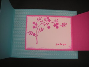 This time the tree image was inked up with the Pink Passion stamp pad and stamped onto whisper white. The edges were sponged in Pink Passion again. The greeting on the inside and outside was from the set “Teeny Tiny Sentiments”.