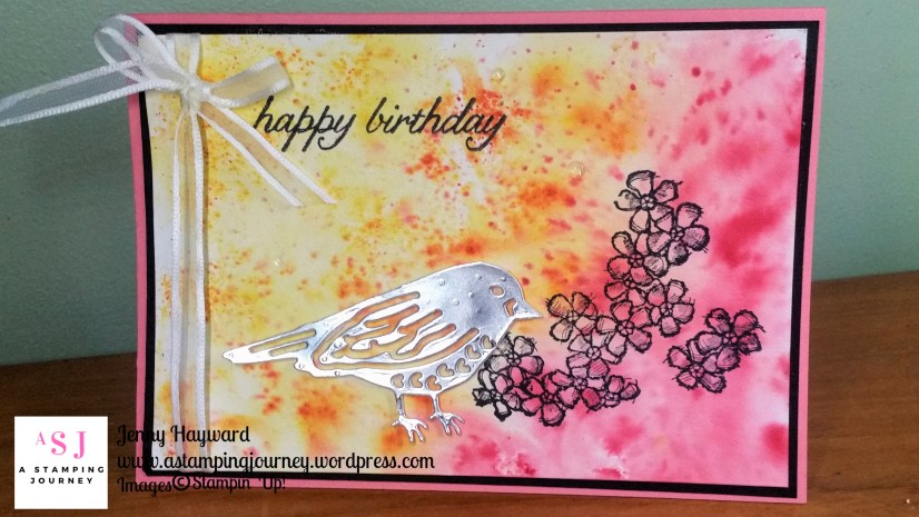 Once dry you can assemble the card. For this one I stamped the flowers from Birthday Blossoms in the corner and the sentiment at the top. I was going to stamp the sentiment and raise it up and I think I should have done that but never mind it’s more to see the Brusho effect. I love the thin White Organza ribbon. So soft and pretty to tie. The base card is Flirty Flamingo. It worked out a good match for it even with using the Red on the card. The bird from Birds and Blooms Thinlits were cut in Silver Foil.