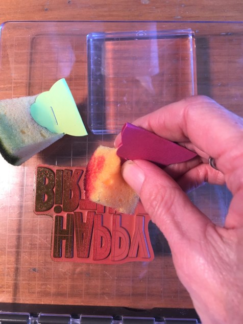 For your card, select your ink colours you want to use and matching sponges or daubers. The colours I used were Granny Apple Green, Melon Mambo, Daffodil Delight and Mango Melody. TIP: I have punched out tabs from cardstock for the ink colours using the Pretty Label Punch. I stapled the tab on to the sponge. You can see it in the photo below. This way you won’t mix up colours when you are sponging.