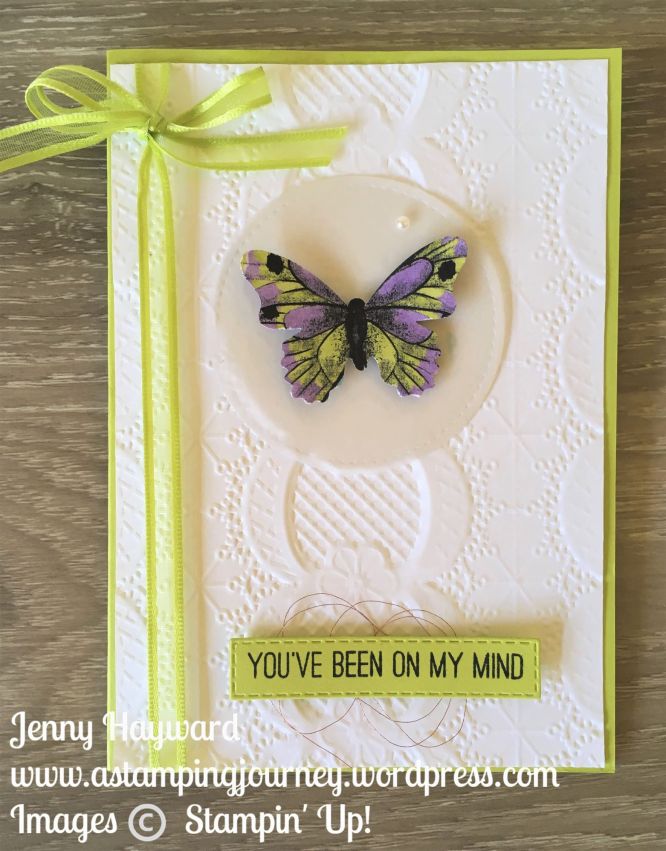 The butterfly is from Butterfly Gala coloured with the Stampin’ Blends. I just happened to have this finished butterfly on my desk left over from a previous project that I didn’t end up using. It worked well I think.