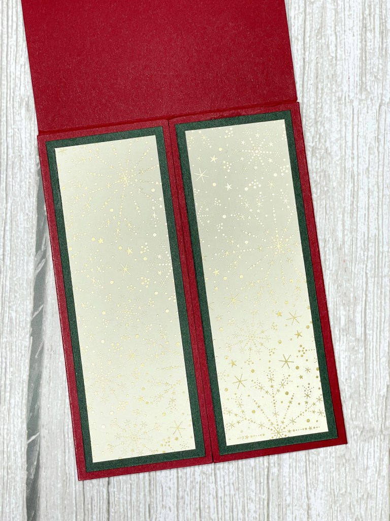 Base card – 8 1/4″ x 9 5/8″. Score at 4 1/8″ on the short side. Turn and score at 4 7/8″ on the long side.