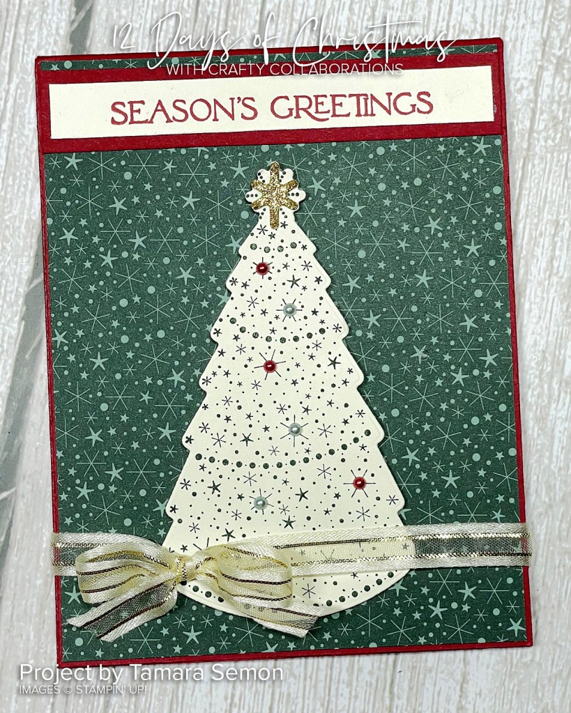The sentiment is from the Trimming the Tree Stamp set and diecut with one of the dies from the Painted Labels Dies. And some shiny Gold Shimmer Ribbon.