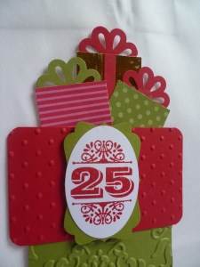 I cut a larger Labels Framelit in Old Olive and ran it through the Big Shot with the Vintage Wallpaper Embossing Folder. I really think the tree could have some Dazzling Diamonds on it to give it some bling. I think I will add that later. The greeting is from ‘More Merry Messages’.