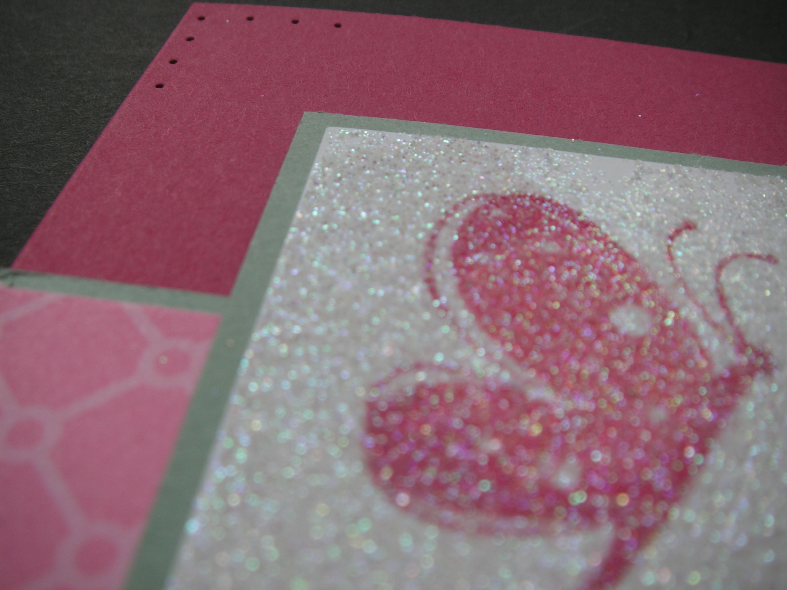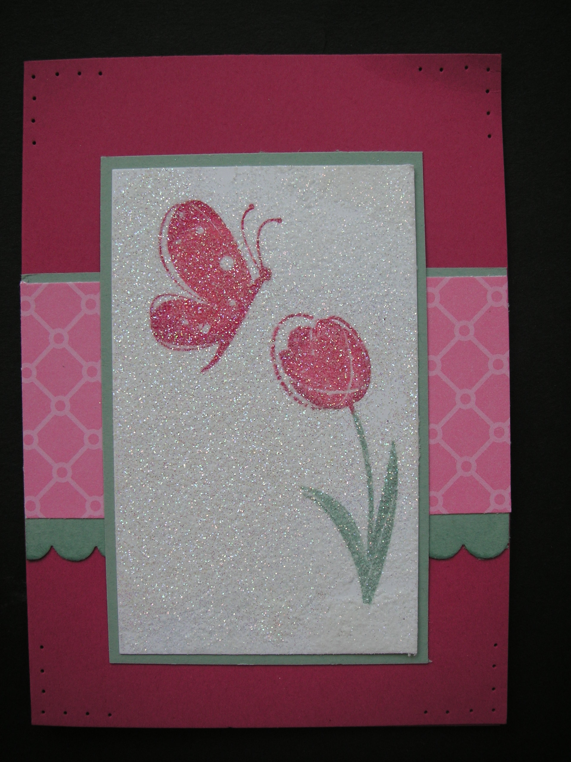 This glitter panel is created with Heat and Stick Powder and Dazzling Diamonds. This really adds an impact – I think! I am going to outline how to do this technique if you are not familiar with this. Now I am a bit of a lazy stamper so I will also let you know a cheat step at the end.