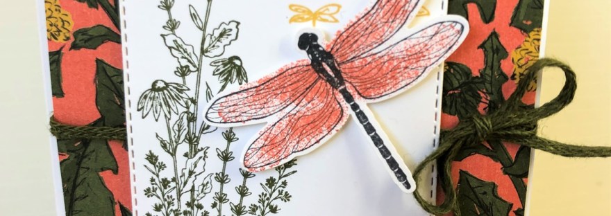 The dragonfly was stamped on white card and the “solid” stamp was stamped in Calypso Coral to add some colour. Before you add this piece and the Designer Series Paper piece to the white card base tie some Mossy Meadow trim around the paper.