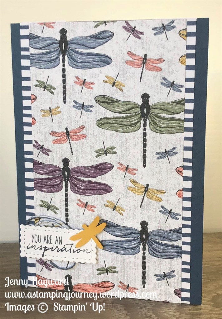 The paper from the Dandy Garden Designer Series Paper with lots of fluttering dragonflies makes for a very quick card. I added some strips of the striped paper behind it for added contrast. Just use strips too. Don’t use a whole piece of the paper behind it as it is wasted.