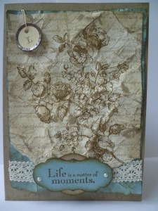 I wrapped some Victoria Lace around the card and cut out a tag with the ‘Lots of Tags’ Die in Baja Breeze and stamped on the text from “Elements of Style”. I punched a circle with the 1 3/8″ in Crumb Cake. These were then both sponged with Soft Suede. I raised these up with dimensionals. I added some pearls and a Vintage Tag with ‘L’ (for Life) in Soft Suede. This one certainly didn’t take as long as the last one!