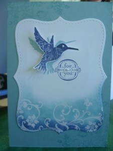 She turned the card and stamped and embossed the bottom section of the Top Note. I like the gradation of colour in the sponging from Night of Navy on the bottom and then lighter Baja Breeze above that. The bird was stamped in Baja Breeze onto the white card and then again on scrap card in Night of Navy. This was cut out and raised up off the card angling it slightly with the first stamped bird. This looks like a bird in flight. The ‘for you’ was stamped in Night of Navy and an adhesive pearl added to the centre.