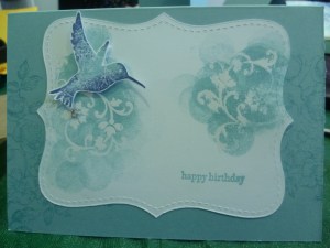 This was inspired by a card on Splitcoast Stampers (I think) by Loni. I couldn’t find it again on her blog. To create the card. I stamped the flowers from Element of Style in Baja Breeze on the Baja Breeze base card. I cut out the top-note in Whisper White. I clear embossed the swirls of Elements of Style and then sponged Baja Breeze ink over. I gave it a little wipe with a tissue to shine it up. I then stamped on the greeting in Night of Navy. The bird was inked in Baja Breeze and then Rock and Rolled in Night of Navy. I cut it out and raised it with dimensionals and added a little bling with the Rhinestones.