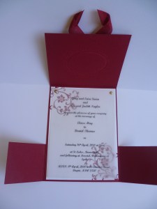 Here is the card open. On the inside I stamped the swirls in Cherry Cobbler on Whisper White. I made up a dummy invite for the competition. I created this on the computer and then printed it out on Vellum. This was attached at the top with Gold Brads.