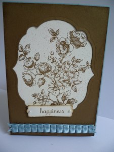 I wanted to use the Framelits to create a frame and use my favourite set that I haven’t used in a while – Elements of Style. I had to play around a little to get the embossed edge around the frame. I have since found a tutorial on how to do this here. (Check out the exploding purse while you are there – Must try that sometime!). It is a bit hard to tell in the photo but I sprayed the Soft Suede frame with Champagne Shimmer Spray. It gives it a nice sparkle which is a shame you can’t see that here! I stamped the flowers in Soft Suede on to Very Vanilla and spritzed the card with the Soft Suede Marker. The sentiment is from ‘Fabulous Phrases’ and was punched out with the Modern Label Punch. I added some new Baja Breeze Pleated Satin ribbon. Gotta love that. So much easier than pleating it yourself!!