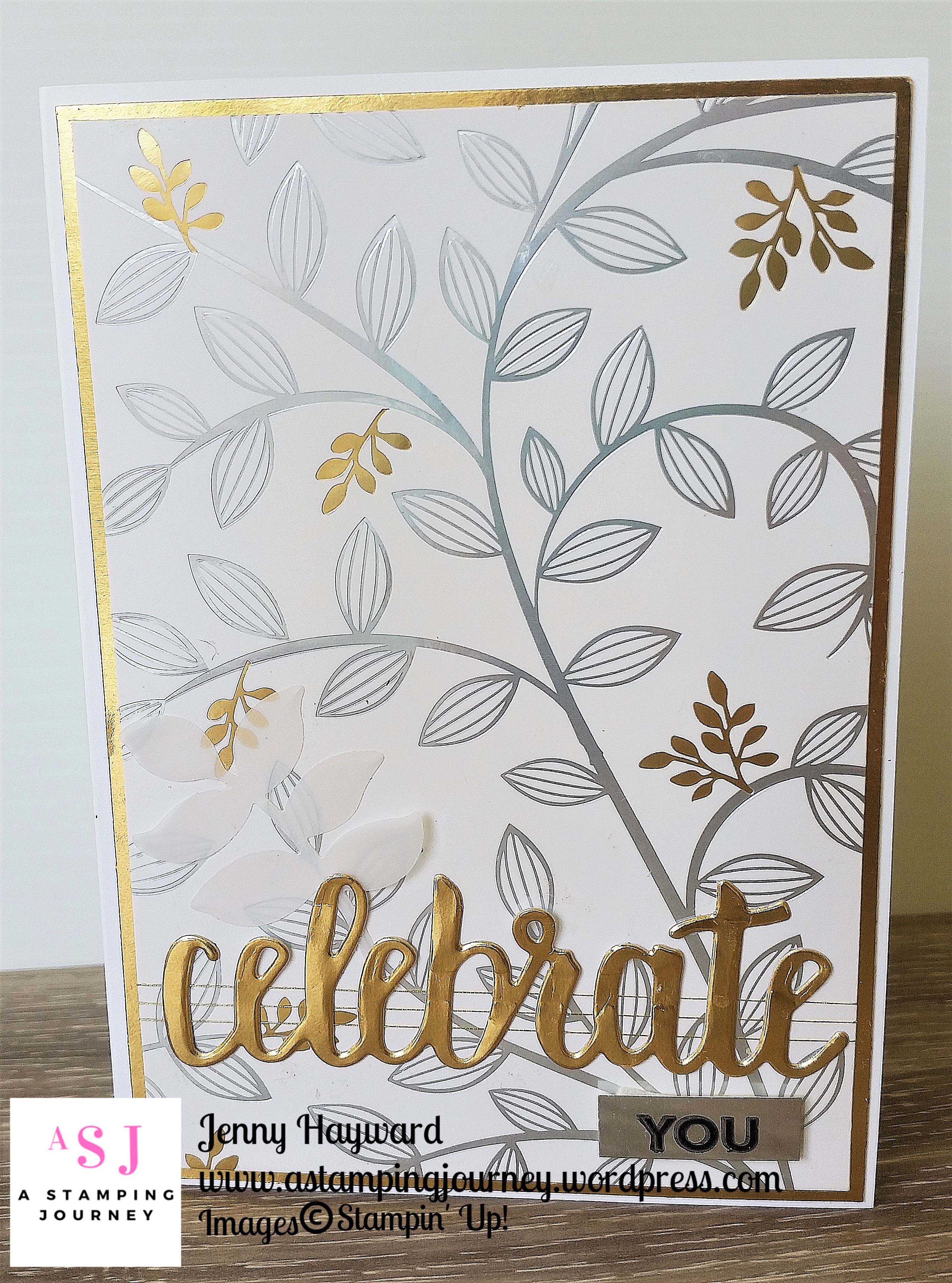 Firstly I wrapped some Gold Thread several times around the bottom section of the paper.  Then adhered this piece to a Gold Foil mat and then adhered them both to a Thick Whisper White card base.  The “celebrate” is cut from the Celebrate You Thinlits from Gold Foil.  Another bonus choice for Sale-A-Bration.  It is hard to tell but I stamped the “YOU” on to a small piece of Silver Foil in Black Stazon.  I also added a small Vellum leaf under the “celebrate”.  This is from the Eclectic Layers Thinlits set.