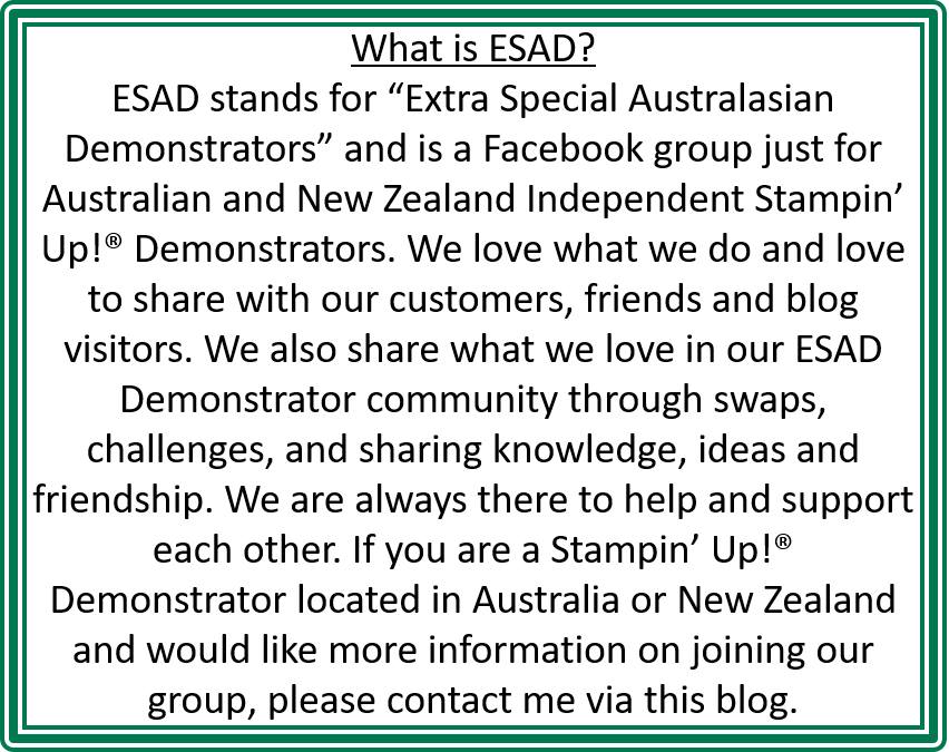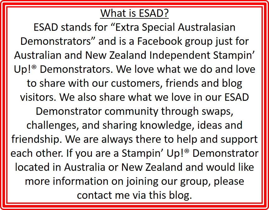 Today I am joining in on a Bloghop with lots of other demonstrators in Australia and New Zealand in the ESAD Facebook group.  (ie Extra Special Australian and New Zealand Demonstrators.  We are all special though!).  We are focusing on Sale-A-Bration.  You might be starting here or might have come from Melinda’s blog -> HERE.  Either way, enjoy the fabulous creations along the way.
