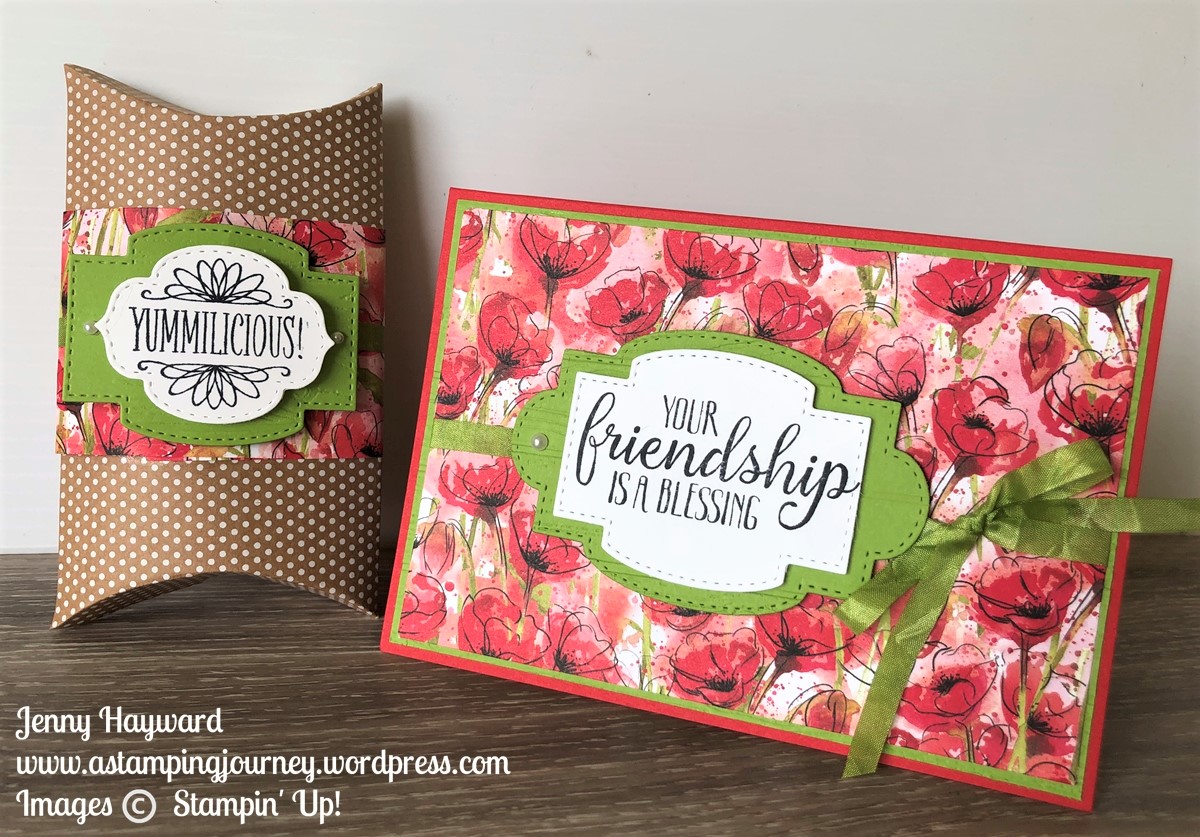Assemble the Kraft Pillow Box. Then wrap a strip of the Peaceful Poppies Designer Series Paper around the Pillow Box.  I wrapped around some more ribbon I had coloured around the box too.