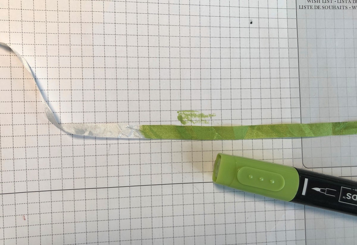Check it out below.  Just run along the ribbon with the Stampin’ Blends Marker. It dries quickly and ready to use on your projects.
