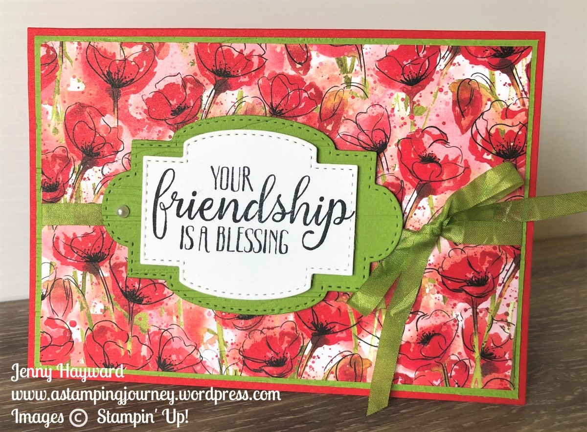 With the card you don’t need too much with the gorgeous Peaceful Poppies Designer Series Paper.  Add a piece of this to a Granny Apple Green card mat and add this to the Poppy Parade card base.  The Granny Apple Green is not a colour that is featured in the paper but I think it gives it a little POP against the Poppy Parade colour.