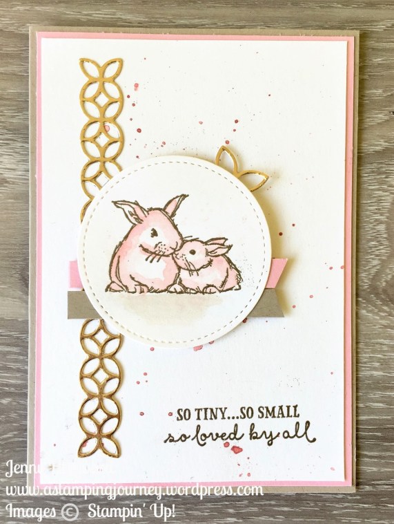 The bunny and the sentiment were heat embossed with Gold Embossing Powder. I used the Shimmery White card. I lightly watercoloured the bunny using the Blushing Bride inkpad and an Aquapainter. A decorative strip and little flower was diecut from Gold Foil using the Flourish Thinlits dies.