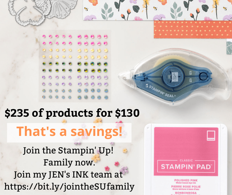 But wait – if you have a large order then get $114 of free products to join Stampin’ Up! family. Come and join my JEN’s INK Team. I look forward to welcoming you.