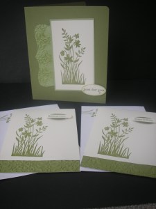 I wanted to play around with the Core’dinations Cardstock. This is really cool stuff. I have embossed it with the Woodgrain Embossing Folder and then sanded it lightly with the ‘new’ sanding system. The paper strips are from the DSP pack ‘Patio Party’. I have stamped on the leaf image from ‘Just Believe’ in Crumb Cake onto the Card base. I stamped the Framelit border from ‘Memorable Moments’ and cut it with the Framelits die. Happy Birthday is stamped in Crumb Cake and the ’50th’ is stamped in the new In-Color Midnight Muse. I added a Vintage Brad to finish it off.