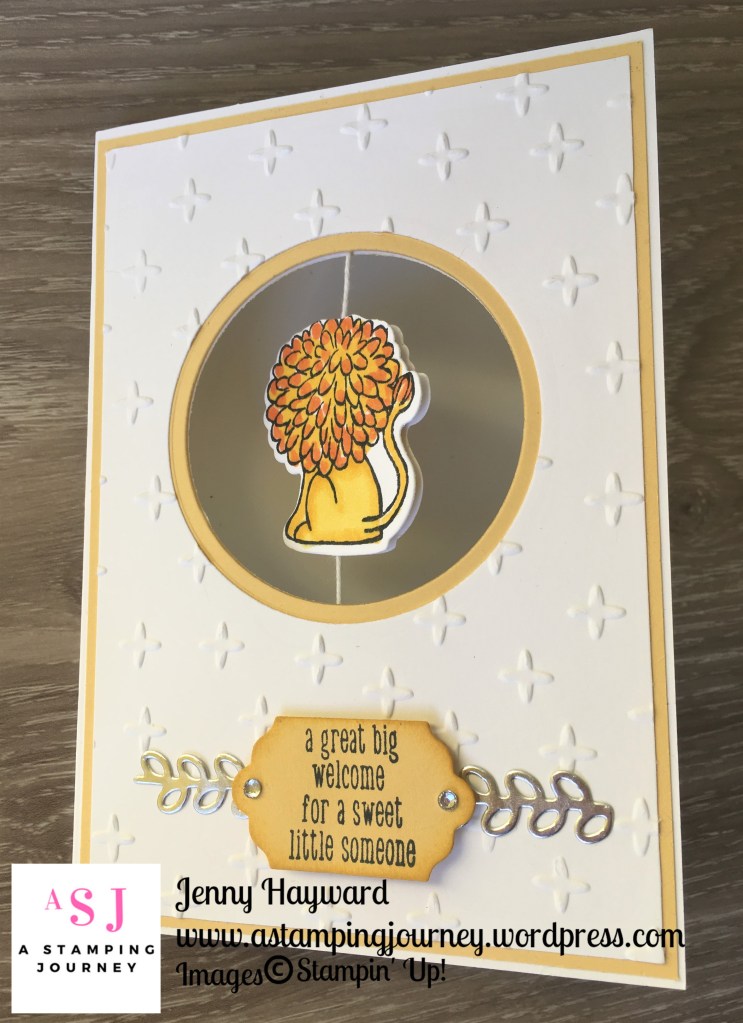 This is the card using the set A Little Wild.  It was the first time I have used this set – and I have had it sitting there for a while! The great thing too is that it has a back stamped image so this works great for the Spinner Cards PLUS it has matching Framelits so you don’t even have to hand cut it.