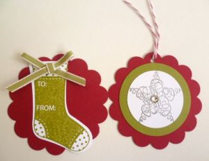 For both of them I punched out a 6cm (2 3/8″) scallop circle in Cherry Cobbler. On the left is the tag from Stitched Stockings set stamped in Old Olive. A small bow from Old Olive Taffeta ribbon was added to the top (Yes, I know it was small I heard enough complaints the whole time about how hard it was to tie the bows – Sorry ladies!!!!)