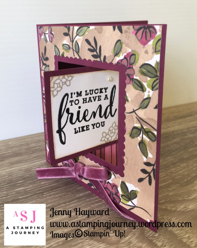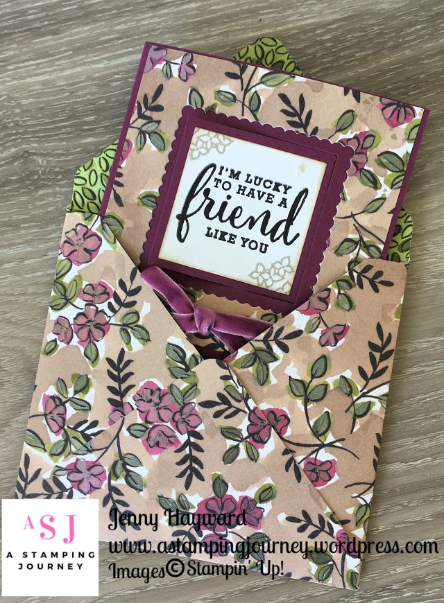 Base card is a standard size card. Designer Series paper is 4mm (1/8″) smaller. I used the Balmy Blue pattern in the Subtles pack New demonstrators receive free in Sale-A-Bration. (They will receive a pack from each Colour Collection. 200 6″x6″ in total valued at $100)