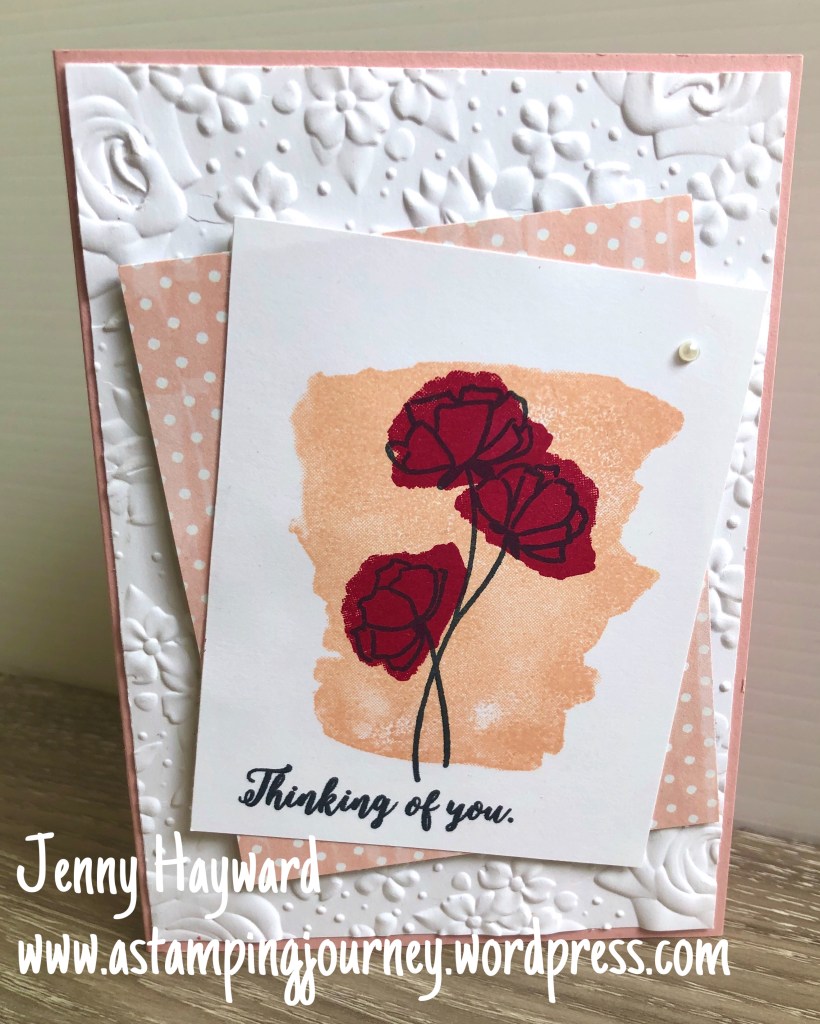 Another beautiful set. I heat embossed the larger flowers in white Embossing powder on vellum. The smaller flowers were heat embossed in white on the Cherry Cobbler card. Full details for this card can be found -> HERE.