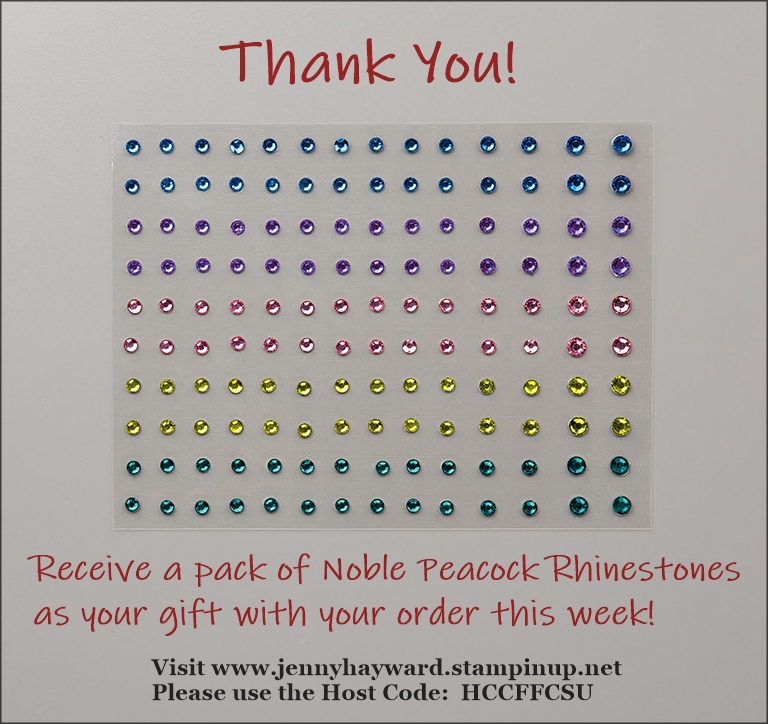 Receive a pack of the Noble Peacock Rhinestones as your gift with orders this week, with any orders over $40. You have got to love that! And remember: it is Bonus Daystime still so if the order is over $90 you will receive your Bonus Day Voucherfor you to redeem it next month and get $9 off your order then.