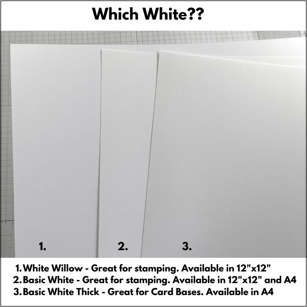 Now there is the White Willow Card. This is similar weight to the Basic White and is good for stamping and layers on card. It does look a little crisper white to the Basic White. This is available in 12″x12″.