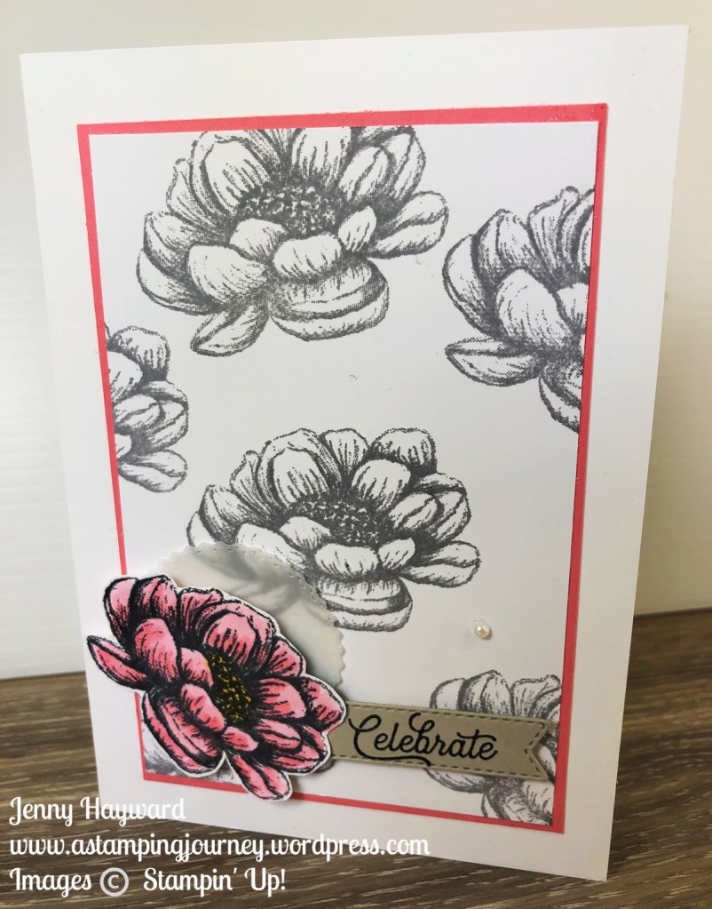 The flower is stamped over the white card with Basic Gray ink. It just makes a simple statement. The flower is stamped again on scrap white card and this one coloured with the Flirty Flamingo and Daffodil Delight Stampin’ Blends. The flower is fussy cut out with scissors.