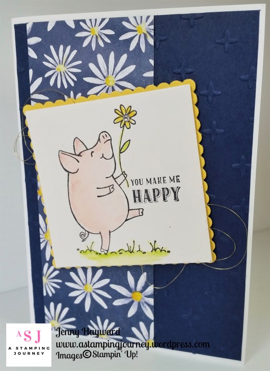 Just a little strip of the Delightful Daisy Paper, one happy piggy coloured with the Aquapainters and ink and a few loopy threads. One Happy Card I think. 🙂