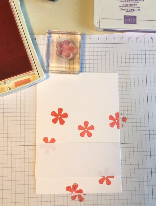 Then I stamped the Flirty Flamingo flowers over the card. I stamped some under the strip just to have some over the edge of the masked area.