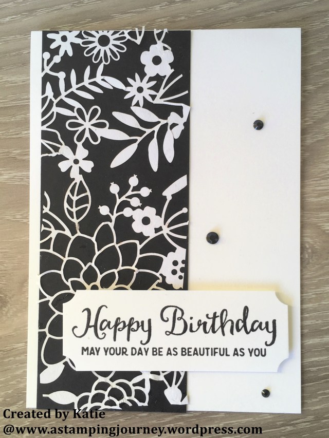 This one below is using that gorgeous Delightfully Detailed Laser Cut paper. I have shown lots of cards using this paper recently. For this card you don’t need much more than backing a section of the paper on to a strip of black card and adhering it to your white base card. It makes it look so elegant don’t you think?? I think from memory the sentiment banner is a strip of white card and using the small circle punch to notch out each corner.