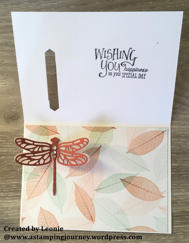 This next one is a fun fold. Adhere a strip of the lovely paper, this one is the Nature’s Poem DSP, down the left hand side of the front of your card. Punch a slit using the Classic Label Punch on the side of the card front. You need to punch it twice to be sure that the dragonfly fits through. Punch it once near the top, then slide it down a little bit and line it up with the previous punch and punch it again. A dragonfly from the Detailed Dragonfly Thinlitswas cut from Vellum and also from Cajun Craze.