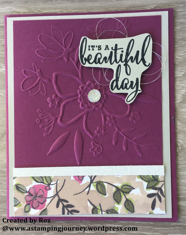 This card uses the lovely Love What You Do set, the Share What You Love paper and the Lovely Floral Embossing Folder.