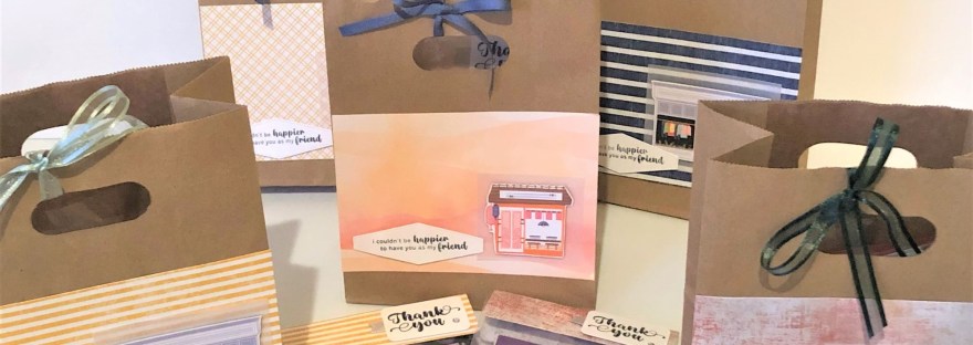 I purchased the brown gift bags from a local discount shop and dressed them up with the Les Shoppes Designer Series Paper shopfronts. The paper mat pieces under the shopfronts were using retired Designer Series Paper.