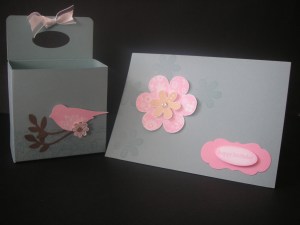 The bird is stamped in Pretty in Pink ink with the hostess set “Punch Potpourri” and punched out with the 2-step bird punch. I punched out the wing in Pretty in Pink and sponged the edge. The leaves were punched out in Certainly Celery. I was pleased how these came out. I even did one for myself – and I haven’t touched the Toblerone yet!!!