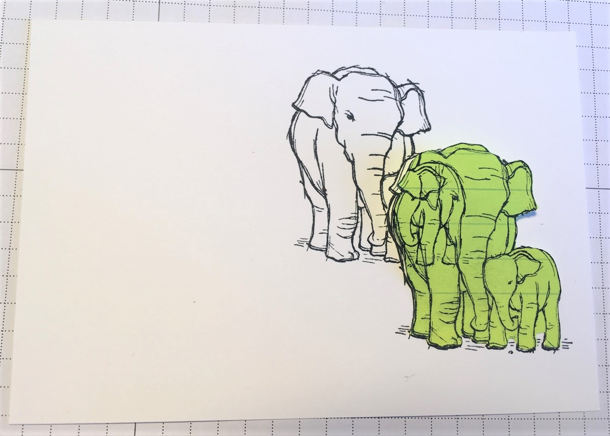 6. Move a Sticky Note to the last elephant stamped on the left and then ink and stamp another one to the left of this.